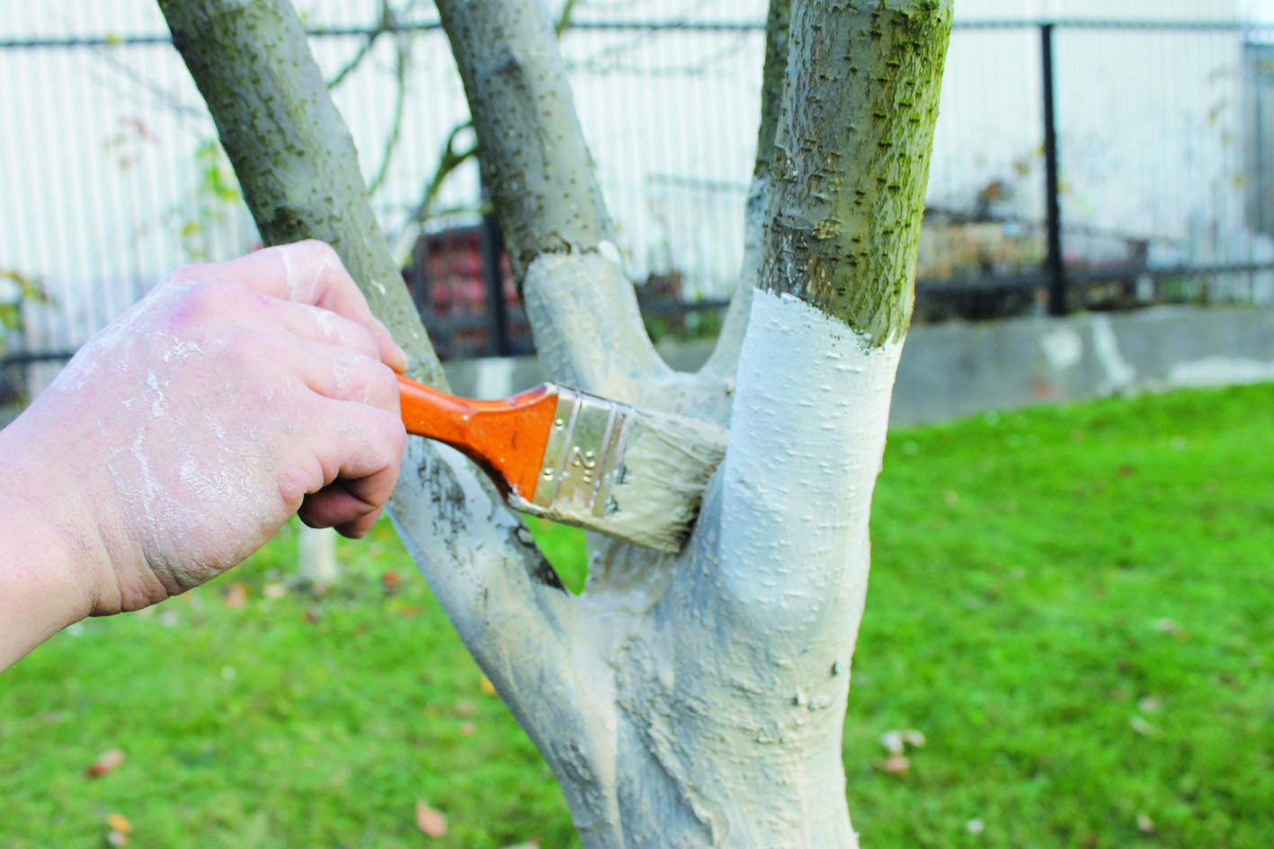 Bevor Obstbäume eine dicke und widerstandsfähige Rinde bilden, benötigen sie im Winter zusätzlichen Schutz. Dann greift jeder Gärtner zur weißen Farbe. In Deutschland wird eine spezielle Variante verwendet, die auf Kalk für Bäume basiert. Dadurch reflektiert sie die Sonnenstrahlen, der Stamm erwärmt sich weniger und der Baum ist weniger Temperaturschwankungen ausgesetzt.